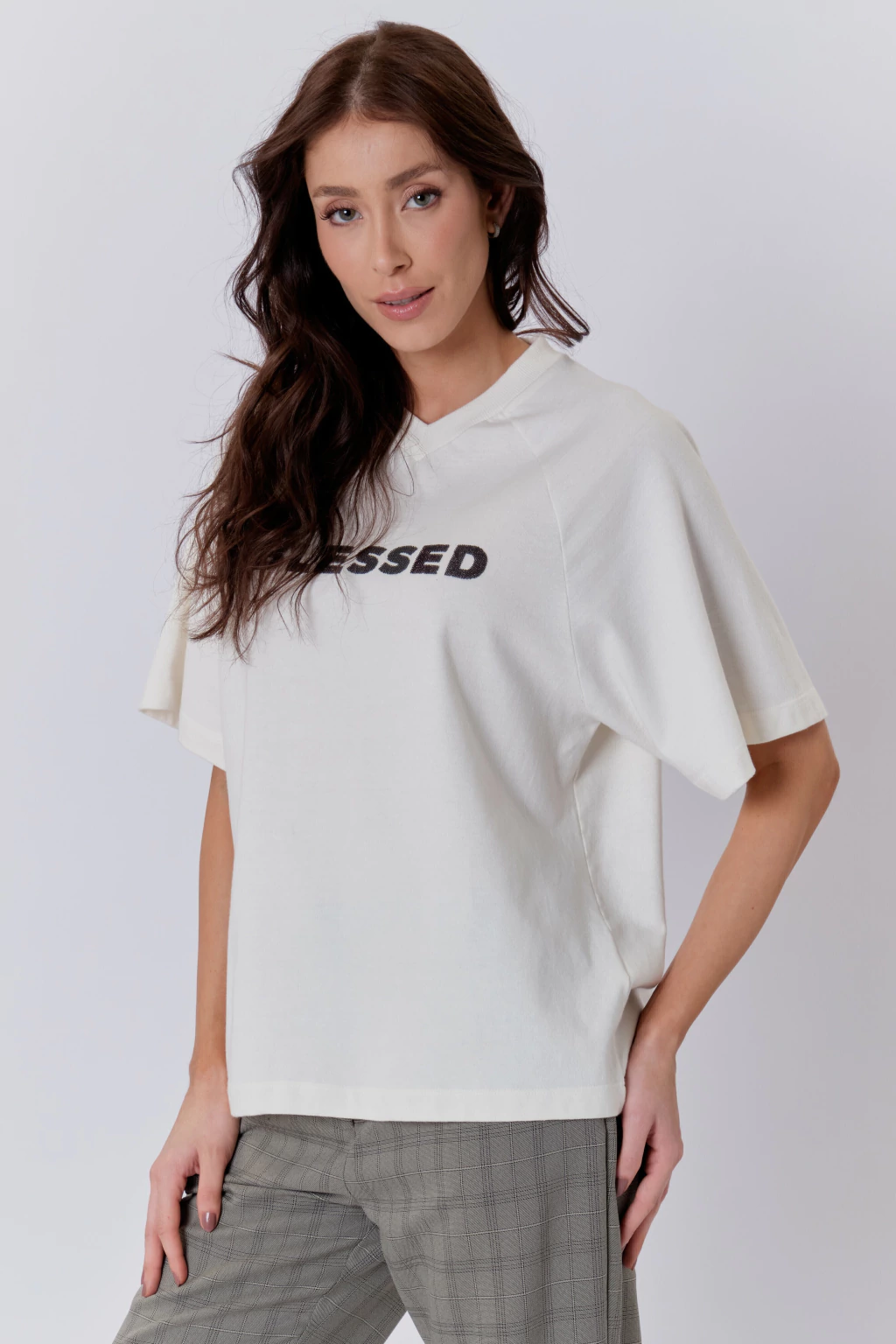 Confeccionada em tecido 100% algodão, a T-shirt Blessed apresenta gola V e um caimento amplo, garantindo conforto absoluto para passeios, restaurantes, reuniões e conferências. Seu design versátil combina com diferentes looks, tornando-se essencial no seu guarda-roupa.